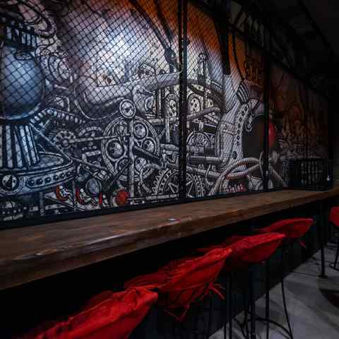 Пространство располагает уютным баром с авторскими напитками и закусками. Здесь проводятся игры-дегустации и выступления профессиональных барменов. Гости могут насладиться зрелищными и познавательными мастер-классами от спикеров школы барного дела. А для праздника заказать пирамиду из бокалов с подсветкой и дымовым эффектом, либо шоу-коктейли, которые добавят ярких эмоций в атмосферу любого мероприятия.
